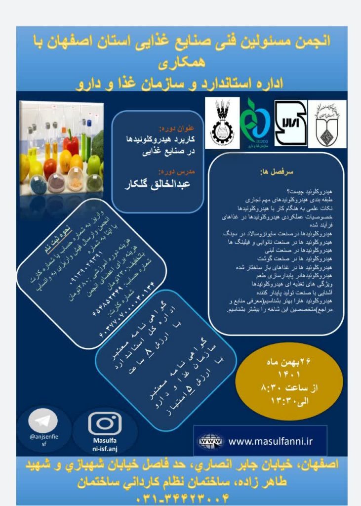 ۱۱ بهمن اخبار و اطلاعیه ها دوره آموزشی کاربرد هیدروکلوئیدها در صنایع غذایی بهمن 11, 1401 توسط narges1234 0 نظر دوره آموزشی کاربرد هیدروکلوئیدها در صنایع غذایی مدرس: جناب آقای دکتر گلکار هزینه دوره: برای اعضا ۲۳۰ هزا...ادامه مطلب