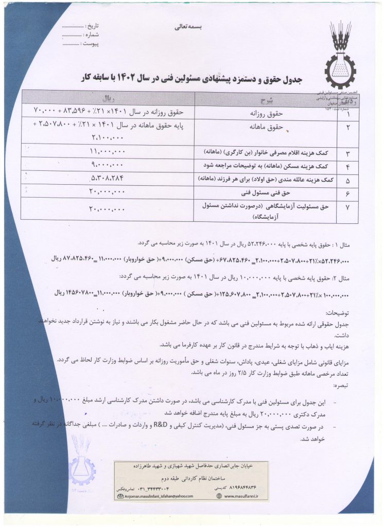 ۰۴ اردیبهشت اخبار و اطلاعیه ها جدول حقوق و دستمزد پیشنهادی مسئولین فنی با سابقه اردیبهشت 4, 1402 توسط narges1234 0 نظر جدول فوق براساس پایه حقوق سال گذشته و مطابق با مثال موجود در متن جدول محاسبه می گردد و موارد دیگر به پایه حقوق...ادامه مطلب